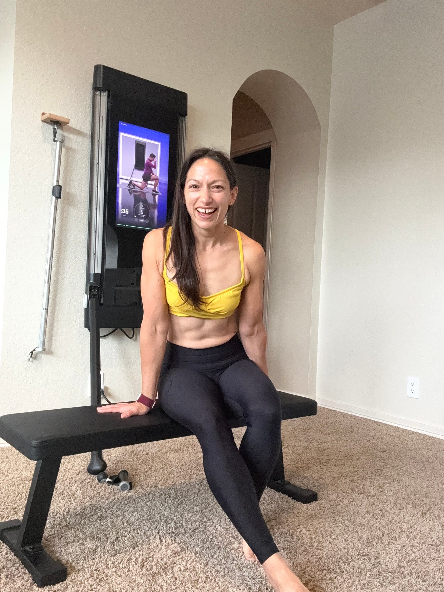 I have a Tonal Home Gym that tracks my weights and automatically increases the weight for me each workout. But if I didn’t have that, I’d find a good workout program to do at home or the gym and just stick with it.